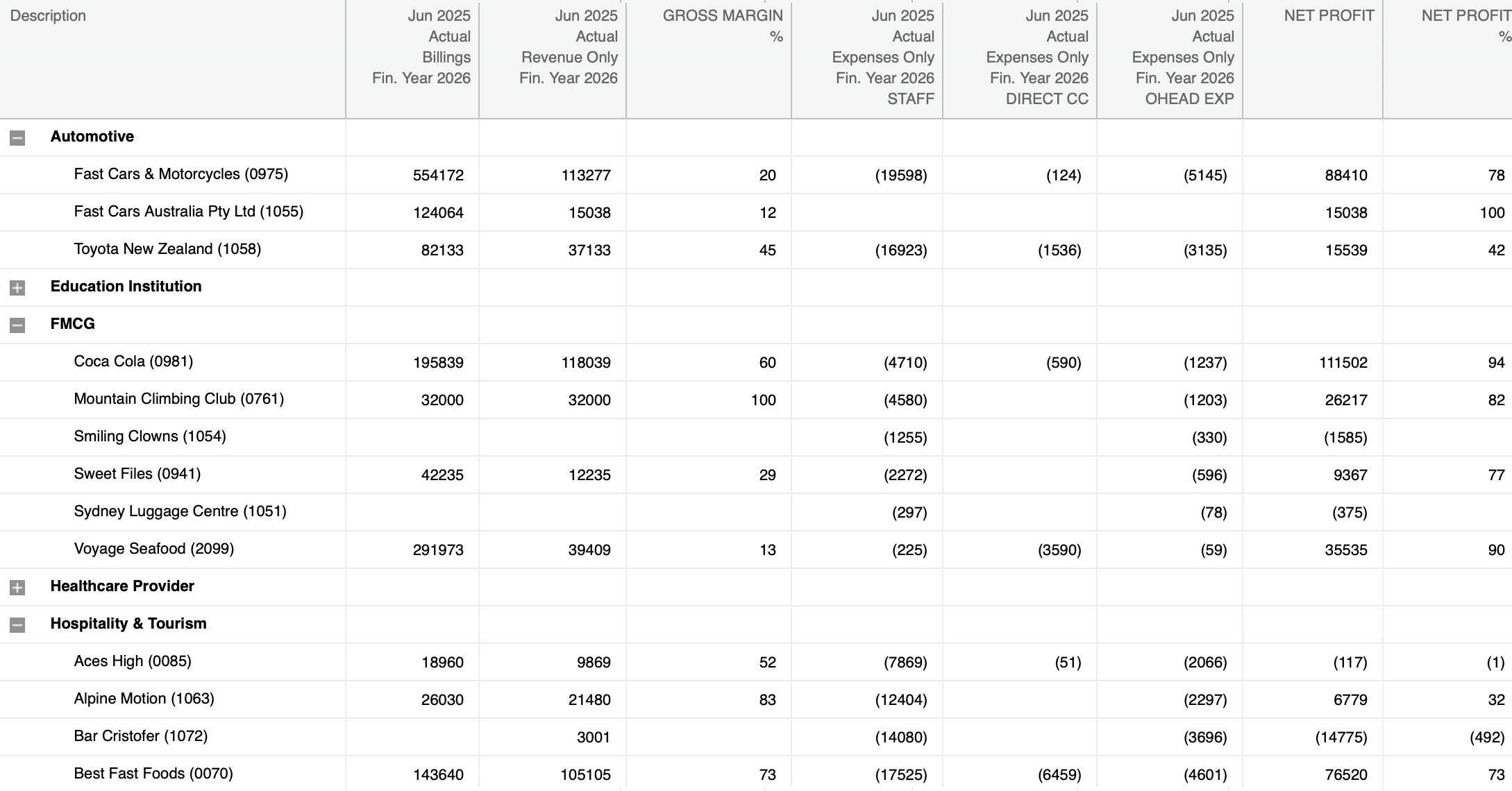A: Pegasus brings general ledger and client data for billing, revenue and expense together in one system, so you can build customised reports that reflect net profit by entity, client, product, group or account lead, without needing spreadsheets or workarounds.
